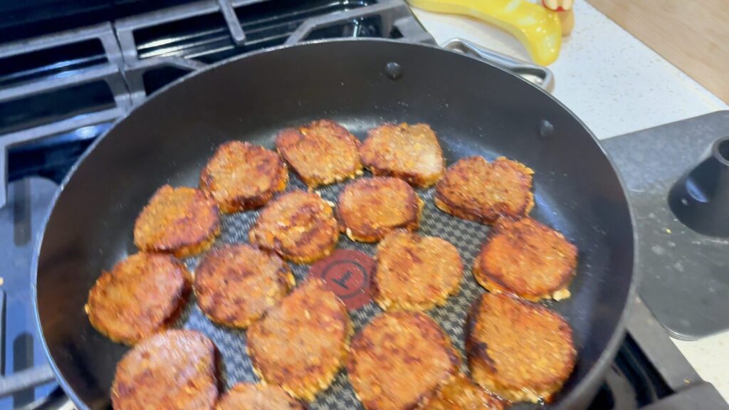 - Slice into patties and cook in a lightly oiled skillet until browned on both sides.